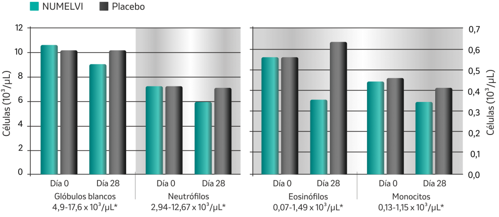 - Conduce a una reducción de los recuentos de glóbulos blancos asociados a la inflamación (dentro del rango de referencia).